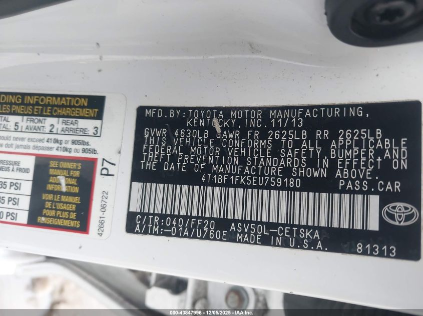 2014 TOYOTA CAMRY 2014 року Бензин, 2.5, Передний привод, vin - 4T1BF1FK5EU759180 из США
