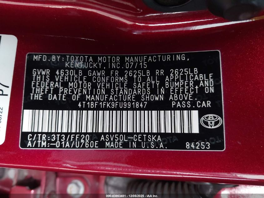 2015 TOYOTA CAMRY 2015 року Бензин, 2.5, Передний привод, vin - 4T1BF1FK9FU991847 из США