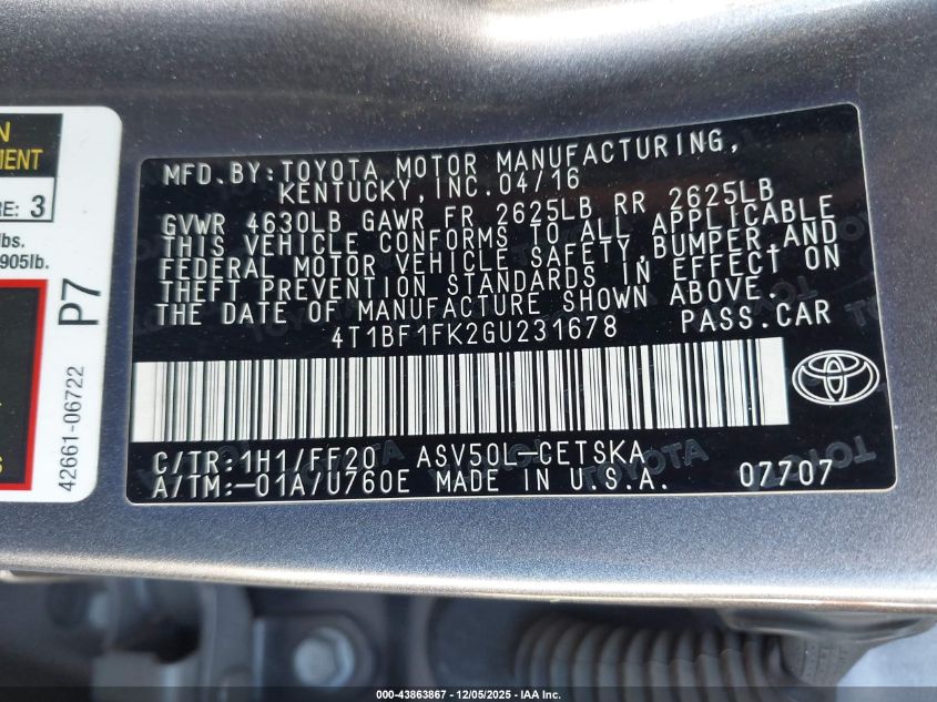 2016 TOYOTA CAMRY 2016 року Бензин, 2.5, Передний привод, vin - 4T1BF1FK2GU231678 из США