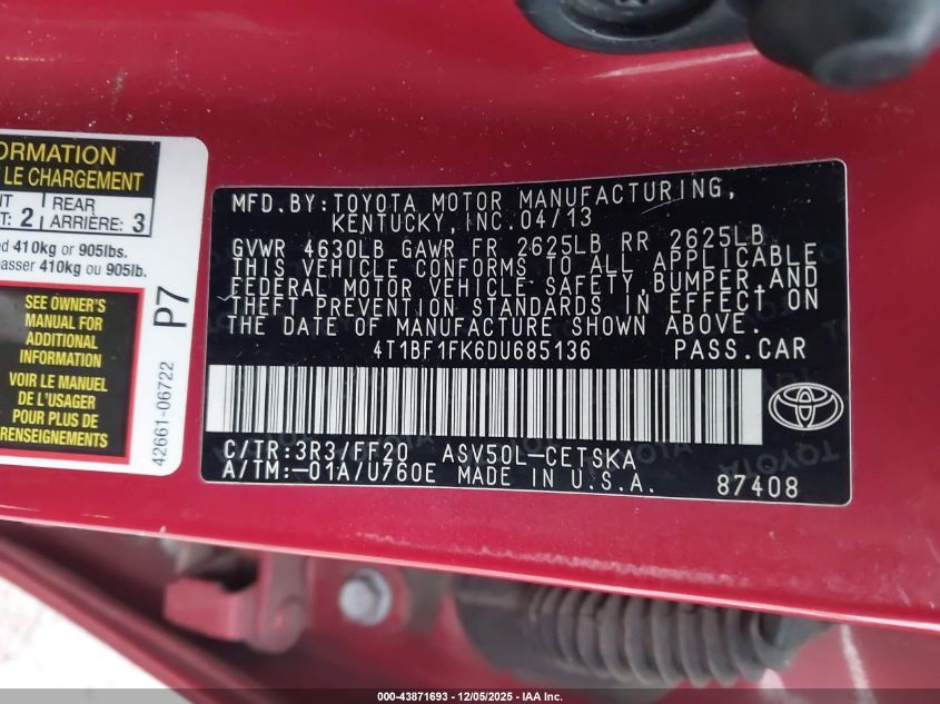 2013 TOYOTA CAMRY 2013 року Бензин, 2.5, Передний привод, vin - 4T1BF1FK6DU685136 из США