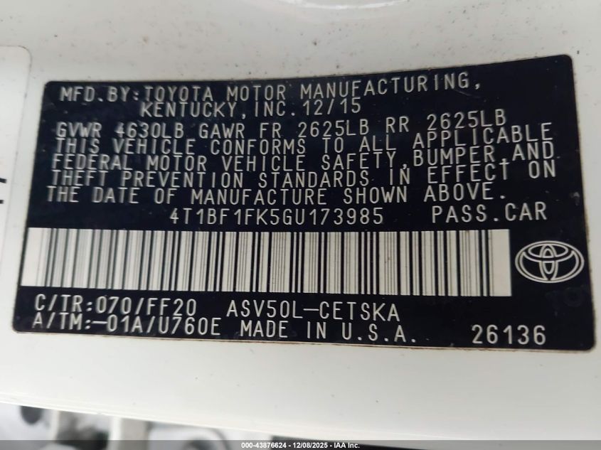 2016 TOYOTA CAMRY 2016 року Бензин, 2.5, Передний привод, vin - 4T1BF1FK5GU173985 из США