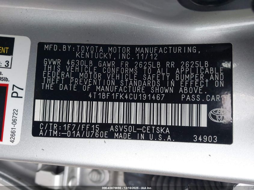 2012 TOYOTA CAMRY 2012 року Бензин, 2.5, Передний привод, vin - 4T1BF1FK4CU191467 из США