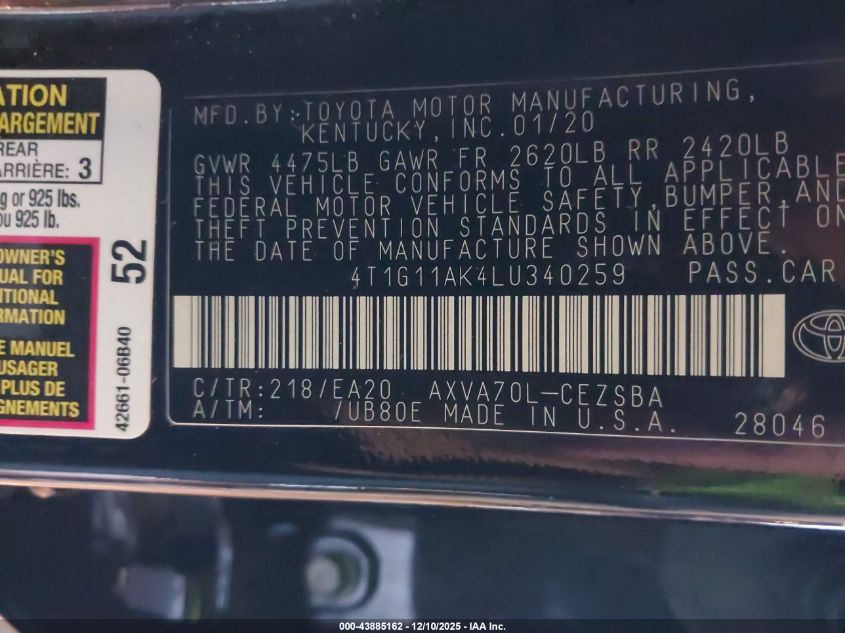 2020 TOYOTA CAMRY 2020 року Бензин, 2.5, Передний привод, vin - 4T1G11AK4LU340259 из США