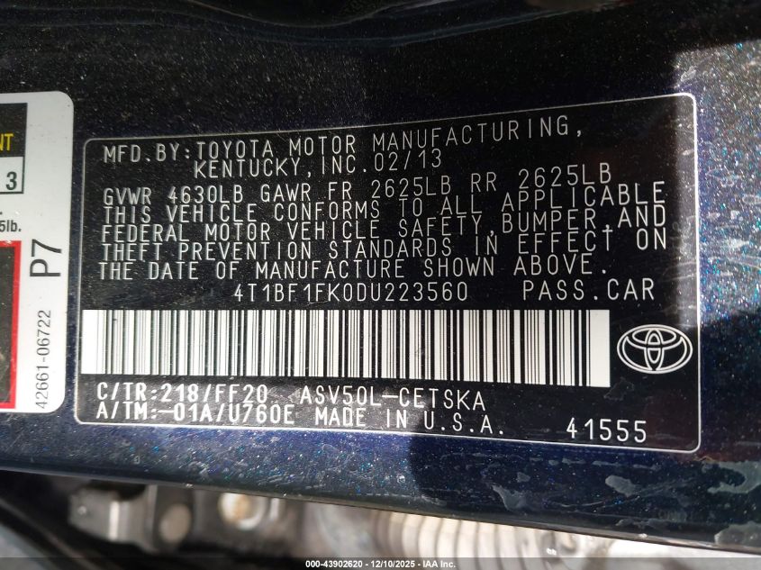 2013 TOYOTA CAMRY 2013 року Бензин, 2.5, Передний привод, vin - 4T1BF1FK0DU223560 из США