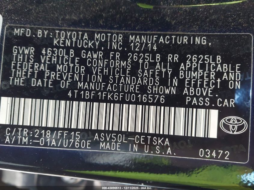 2015 TOYOTA CAMRY 2015 року Бензин, 2.5, Передний привод, vin - 4T1BF1FK6FU016576 из США