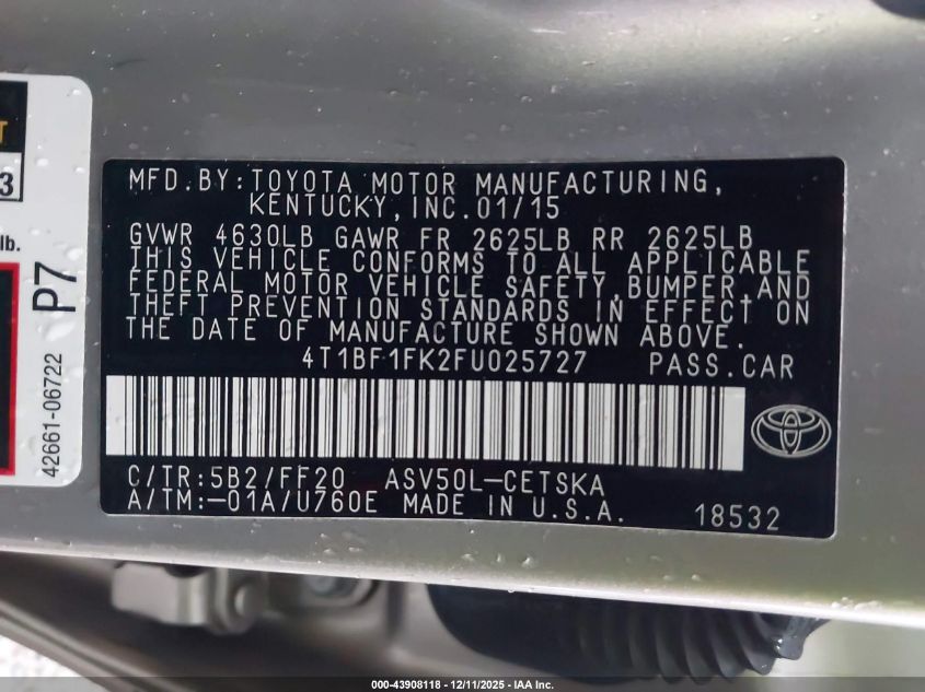 2015 TOYOTA CAMRY 2015 року Бензин, 2.5, Передний привод, vin - 4T1BF1FK2FU025727 из США
