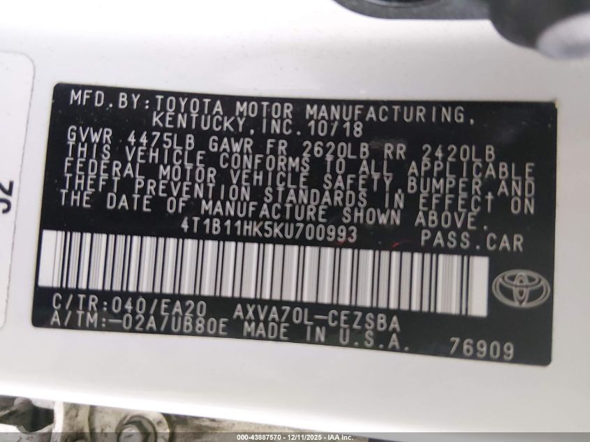2019 TOYOTA CAMRY 2019 року Бензин, 2.5, Передний привод, vin - 4T1B11HK5KU700993 из США