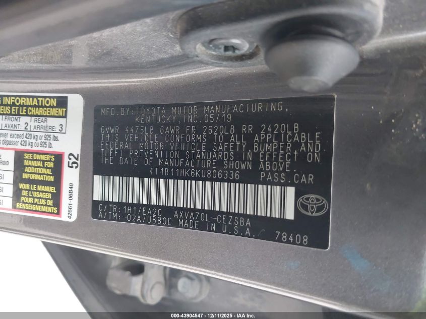 2019 TOYOTA CAMRY 2019 року Бензин, 2.5, Передний привод, vin - 4T1B11HK6KU806336 из США