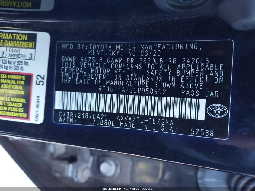 2020 TOYOTA CAMRY 2020 року Бензин, 2.5, Передний привод, vin - 4T1G11AK3LU958902 из США