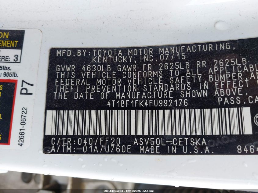 2015 TOYOTA CAMRY 2015 року Бензин, 2.5, Передний привод, vin - 4T1BF1FK4FU992176 из США
