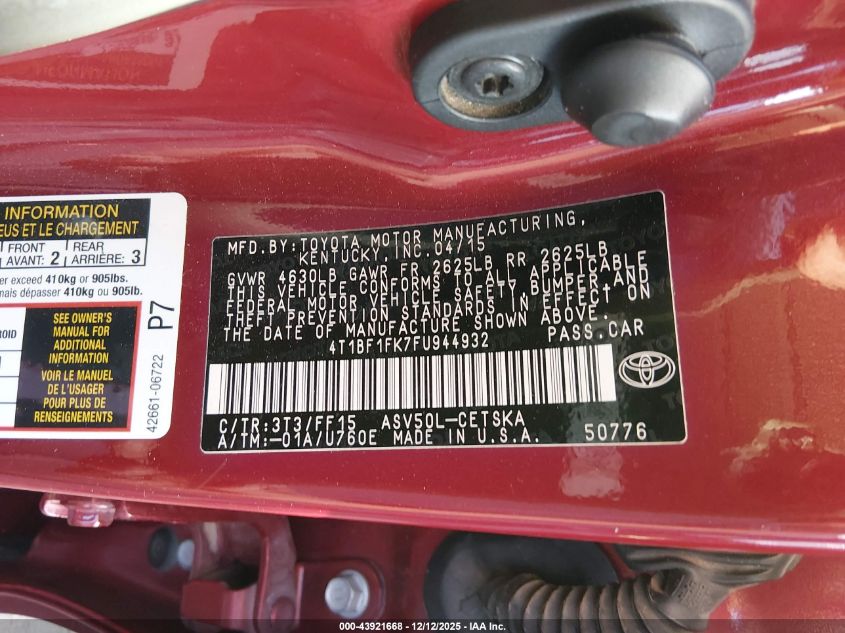2015 TOYOTA CAMRY 2015 року Бензин, 2.5, Передний привод, vin - 4T1BF1FK7FU944932 из США
