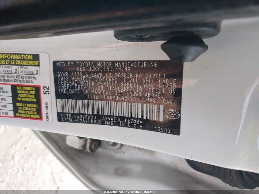2019 TOYOTA CAMRY 2019 року Бензин, 2.5, Передний привод, vin - 4T1B11HK6KU192758 из США