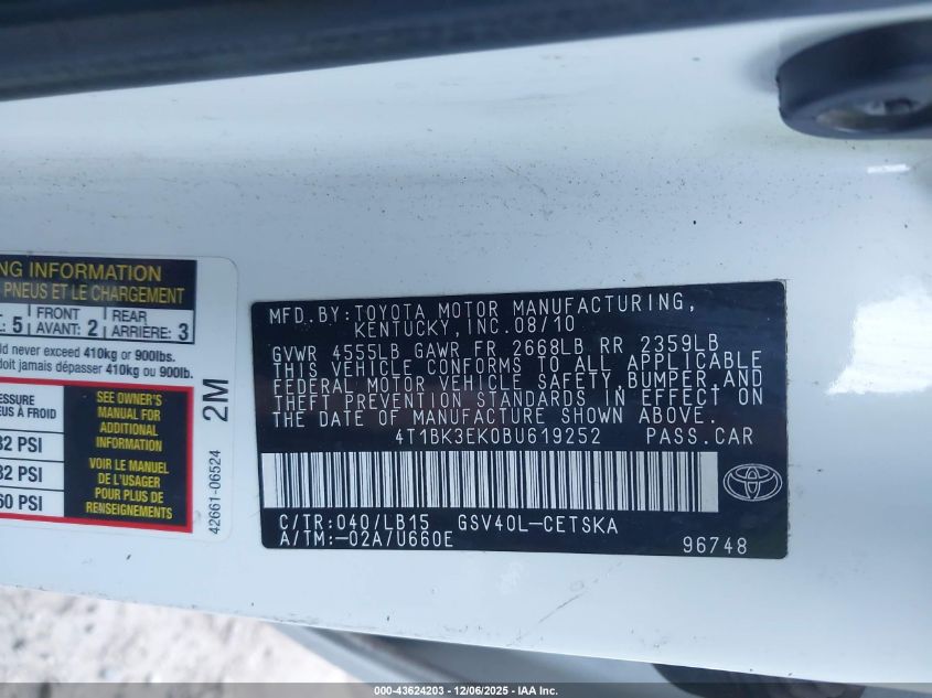 2011 TOYOTA CAMRY 2011 року Бензин, 3.5, Передний привод, vin - 4T1BK3EK0BU619252 из США