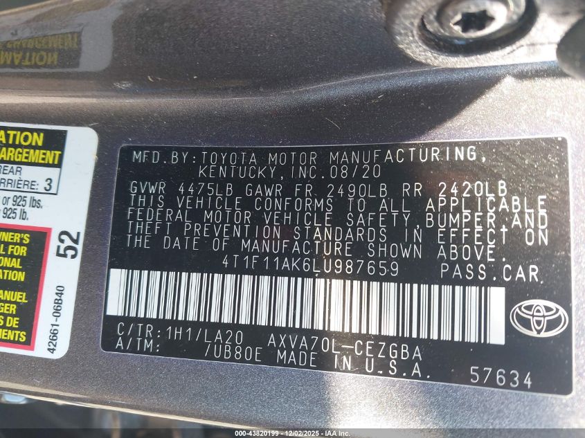 2020 TOYOTA CAMRY 2020 року Бензин, 2.5, Передний привод, vin - 4T1F11AK6LU987659 из США