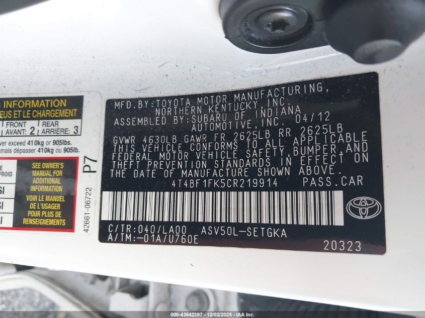 2012 TOYOTA CAMRY 2012 року Бензин, 2.5, Передний привод, vin - 4T4BF1FK5CR219914 из США