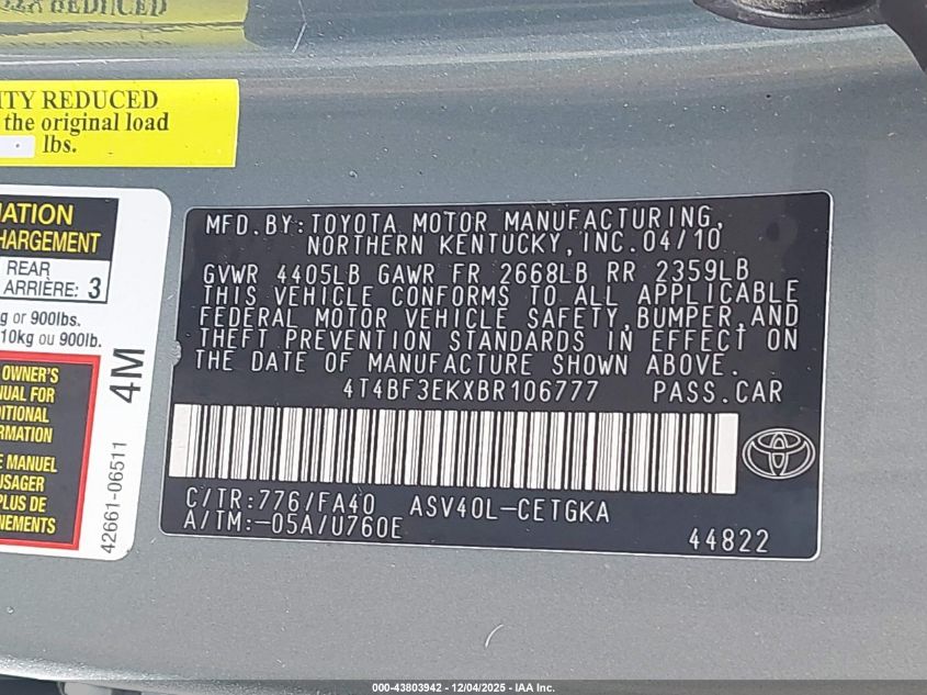 2011 TOYOTA CAMRY 2011 року Бензин, 2.5, Передний привод, vin - 4T4BF3EKXBR106777 из США