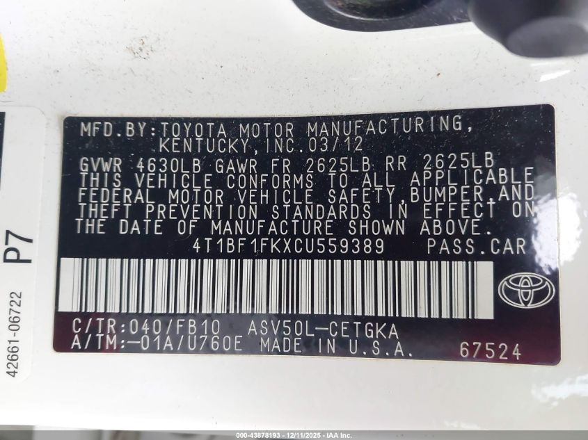 2012 TOYOTA CAMRY 2012 року Бензин, 2.5, Передний привод, vin - 4T1BF1FKXCU559389 из США