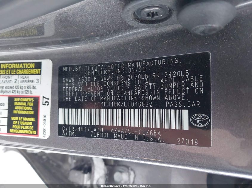 2020 TOYOTA CAMRY 2020 року Бензин, 2.5, Полный привод, vin - 4T1F11BK7LU016832 из США