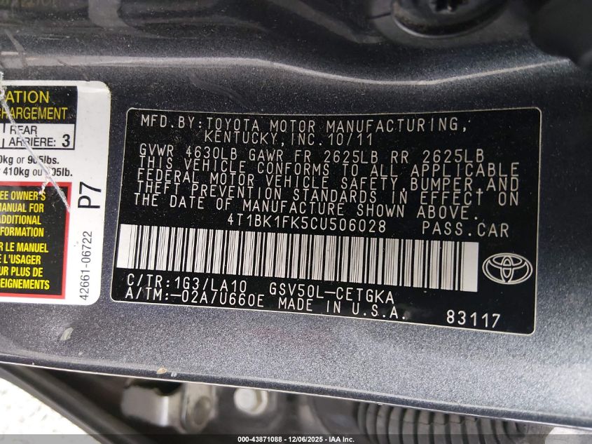 2012 TOYOTA CAMRY 2012 року Бензин, 3.5, Передний привод, vin - 4T1BK1FK5CU506028 из США