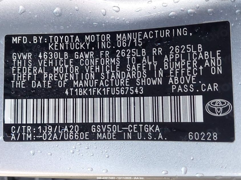 2015 TOYOTA CAMRY 2015 року Бензин, 3.5, Передний привод, vin - 4T1BK1FK1FU567543 из США