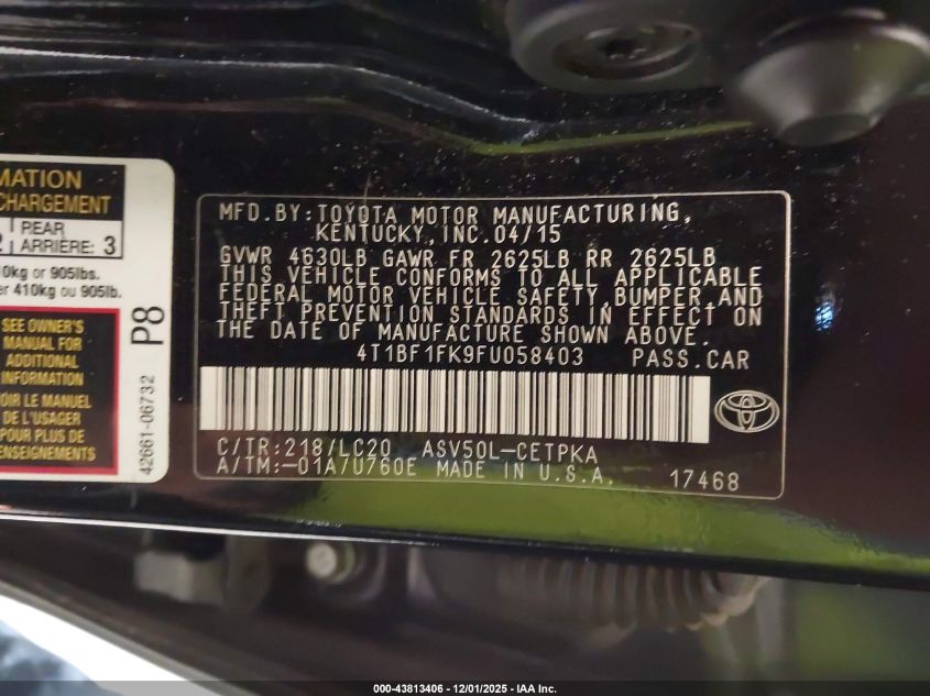 2015 TOYOTA CAMRY 2015 року Бензин, 2.5, Передний привод, vin - 4T1BF1FK9FU058403 из США