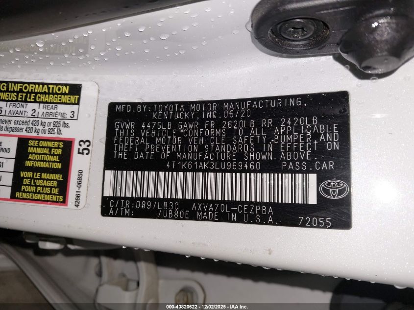 2020 TOYOTA CAMRY 2020 року Бензин, 2.5, Передний привод, vin - 4T1K61AK3LU969460 из США