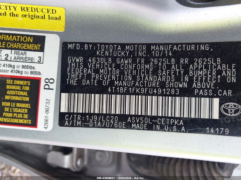2015 TOYOTA CAMRY 2015 року Бензин, 2.5, Передний привод, vin - 4T1BF1FK9FU491283 из США