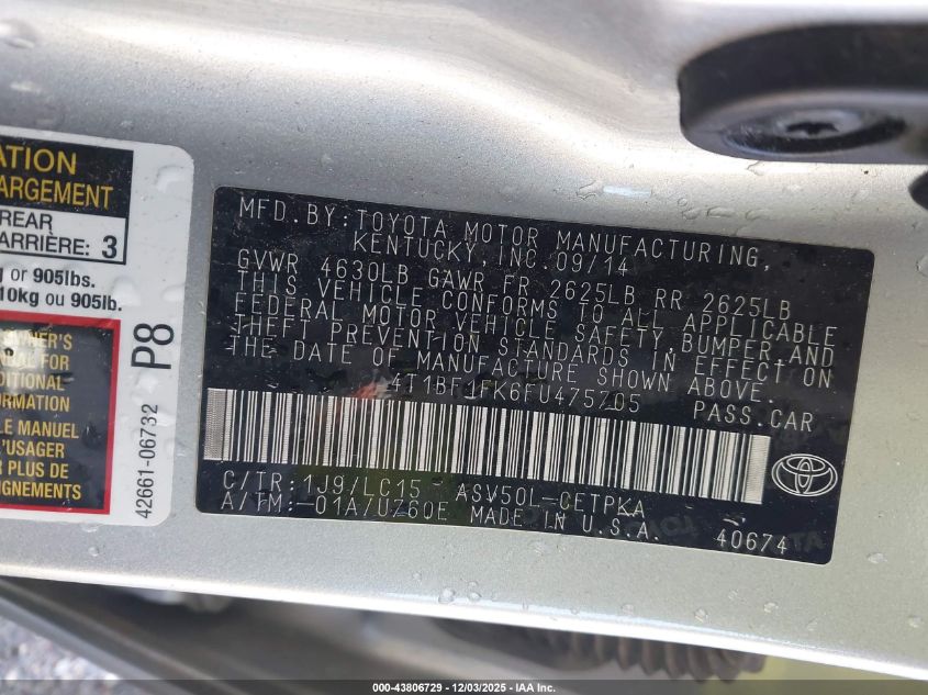 2015 TOYOTA CAMRY 2015 року Бензин, 2.5, Передний привод, vin - 4T1BF1FK6FU475705 из США
