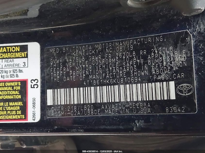 2019 TOYOTA CAMRY 2019 року Бензин, 2.5, Передний привод, vin - 4T1B61HK6KU810694 из США