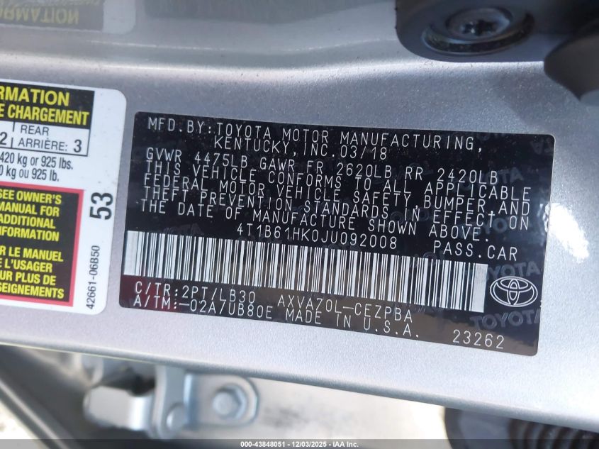2018 TOYOTA CAMRY 2018 року Бензин, 2.5, Передний привод, vin - 4T1B61HK0JU092008 из США