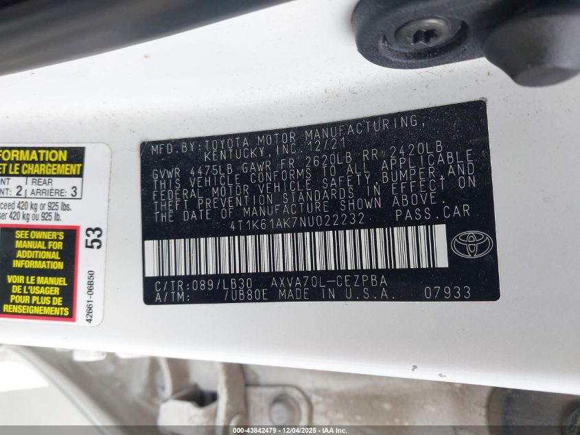 2022 TOYOTA CAMRY 2022 року Бензин, 2.5, Передний привод, vin - 4T1K61AK7NU022232 из США