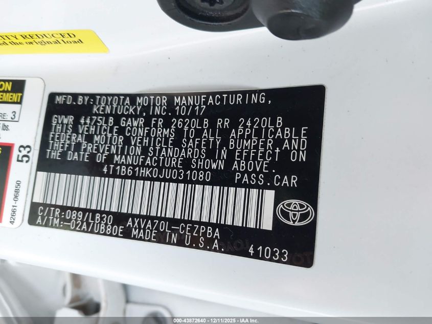 2018 TOYOTA CAMRY 2018 року Бензин, 2.5, Передний привод, vin - 4T1B61HK0JU031080 из США