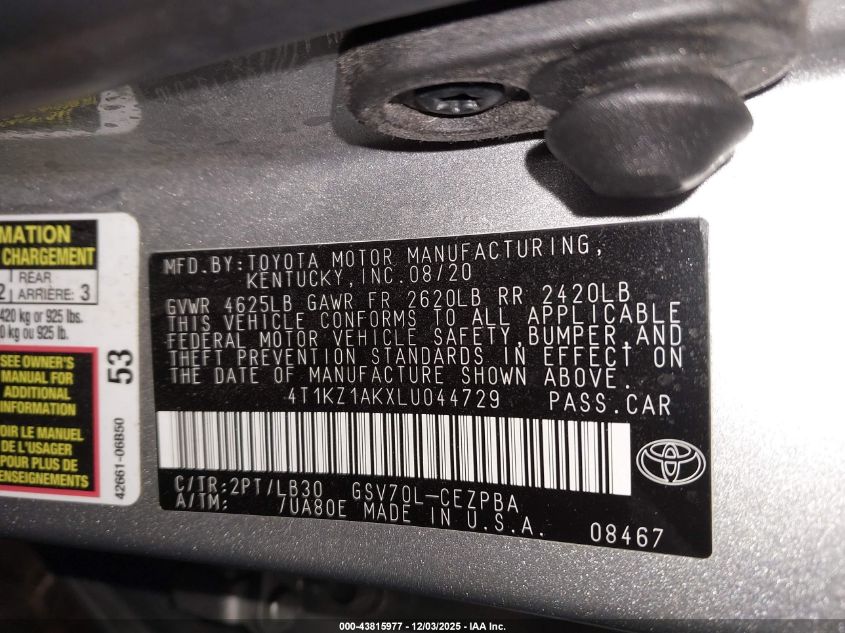 2020 TOYOTA CAMRY 2020 року Бензин, 3.5, Передний привод, vin - 4T1KZ1AKXLU044729 из США