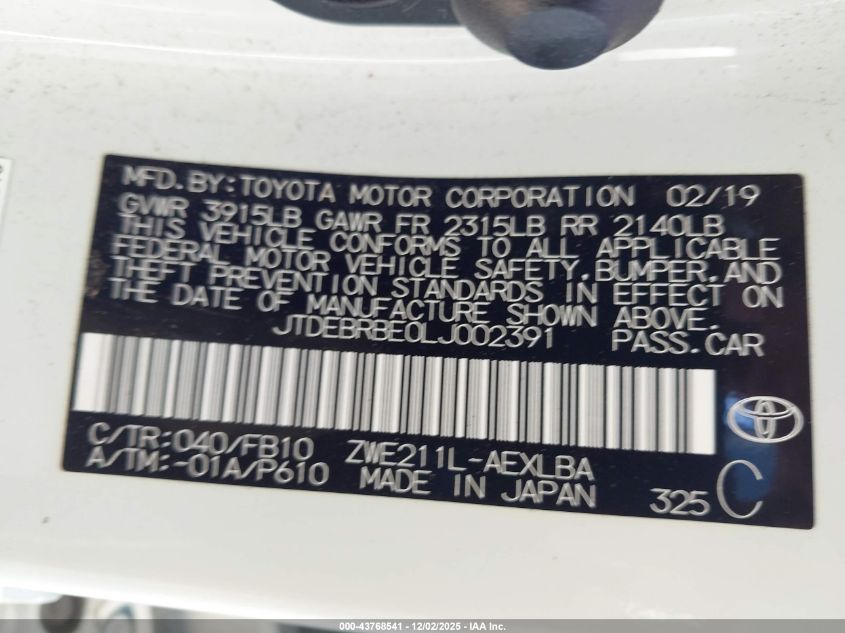 2020 TOYOTA COROLLA 2020 року Гибрид, 1.8, Передний привод, vin - JTDEBRBE0LJ002391 из США