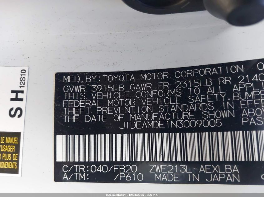 2022 TOYOTA COROLLA 2022 року Гибрид, 1.8, Передний привод, vin - JTDEAMDE1N3009005 из США