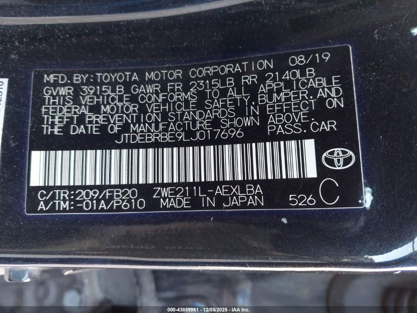 2020 TOYOTA COROLLA 2020 року Гибрид, 1.8, Передний привод, vin - JTDEBRBE9LJ017696 из США