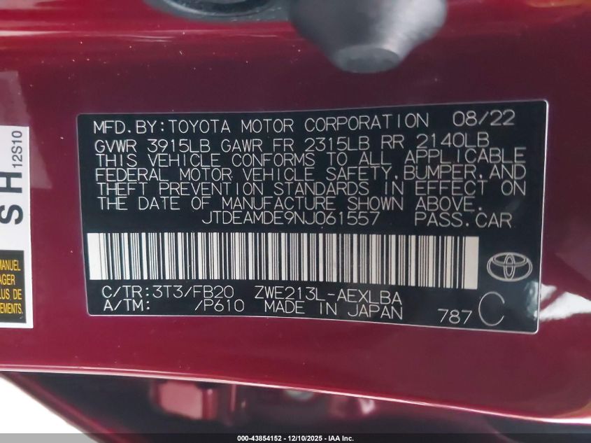 2022 TOYOTA COROLLA 2022 року Гибрид, 1.8, Передний привод, vin - JTDEAMDE9NJ061557 из США