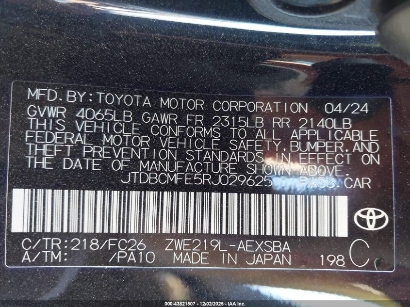 2024 TOYOTA COROLLA 2024 року Гибрид, 1.8, Передний привод, vin - JTDBCMFE5RJ029625 из США