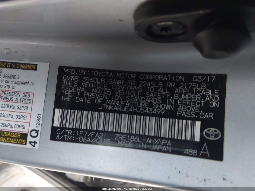 2017 TOYOTA COROLLA 2017 року Бензин, 1.8, Передний привод, vin - JTNKARJE4HJ543499 из США