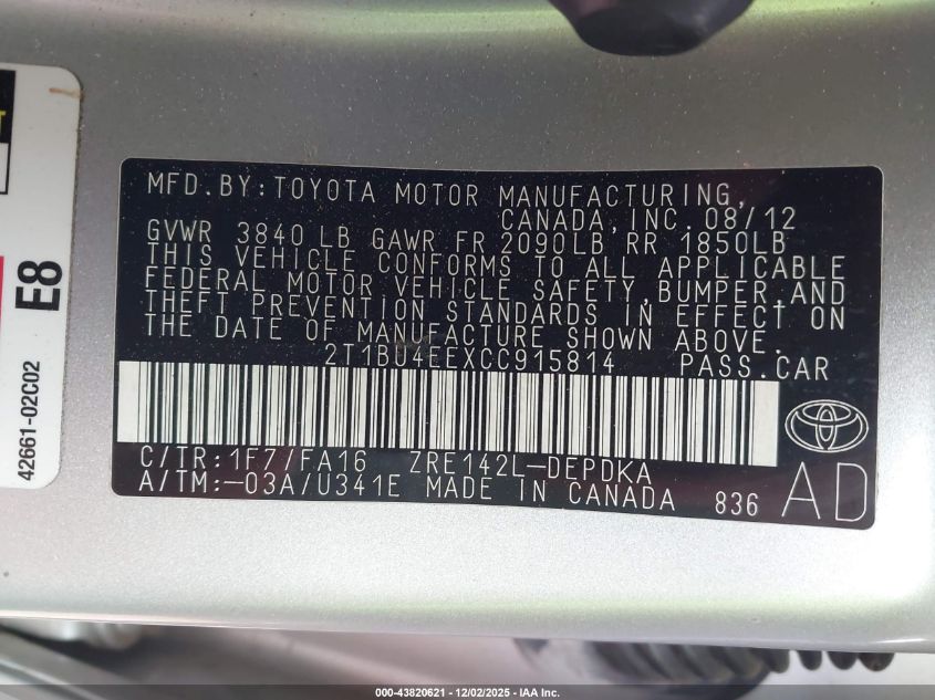 2012 TOYOTA COROLLA 2012 року Бензин, 1.8, Передний привод, vin - 2T1BU4EEXCC915814 из США
