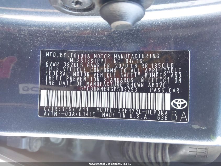 2016 TOYOTA COROLLA 2016 року Бензин, 1.8, Передний привод, vin - 5YFBURHE4GP502253 из США