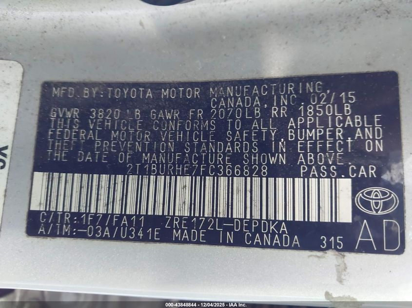 2015 TOYOTA COROLLA 2015 року Бензин, 1.8, Передний привод, vin - 2T1BURHE7FC366828 из США