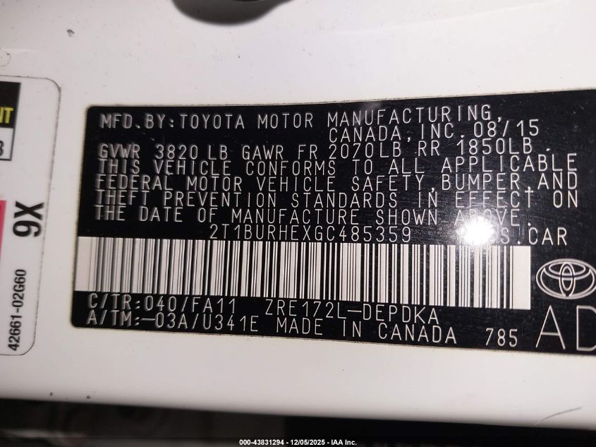 2016 TOYOTA COROLLA 2016 року Бензин, 1.8, Передний привод, vin - 2T1BURHEXGC485359 из США