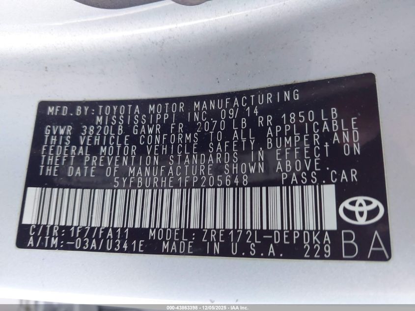 2015 TOYOTA COROLLA 2015 року Бензин, 1.8, Передний привод, vin - 5YFBURHE1FP205648 из США