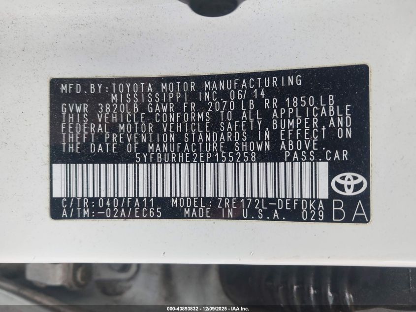 2014 TOYOTA COROLLA 2014 року Бензин, 1.8, Передний привод, vin - 5YFBURHE2EP155258 из США