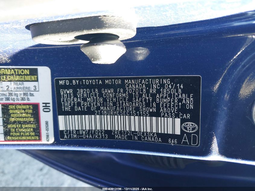 2014 TOYOTA COROLLA 2014 року Бензин, 1.8, Передний привод, vin - 2T1BURHE5EC151155 из США