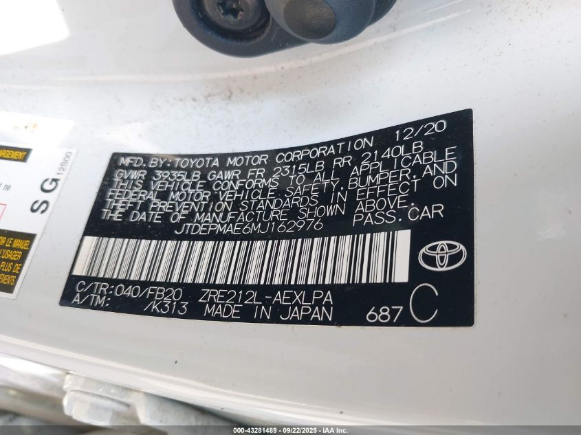 Цвет БелыйЦилиндры 4Привод Передний приводVIN JTDEPMAE6MJ162976Состояние Заводится и едет (проверено)Повреждения Правая сторонаДата аукциона 2025-12-12 AutoRIA