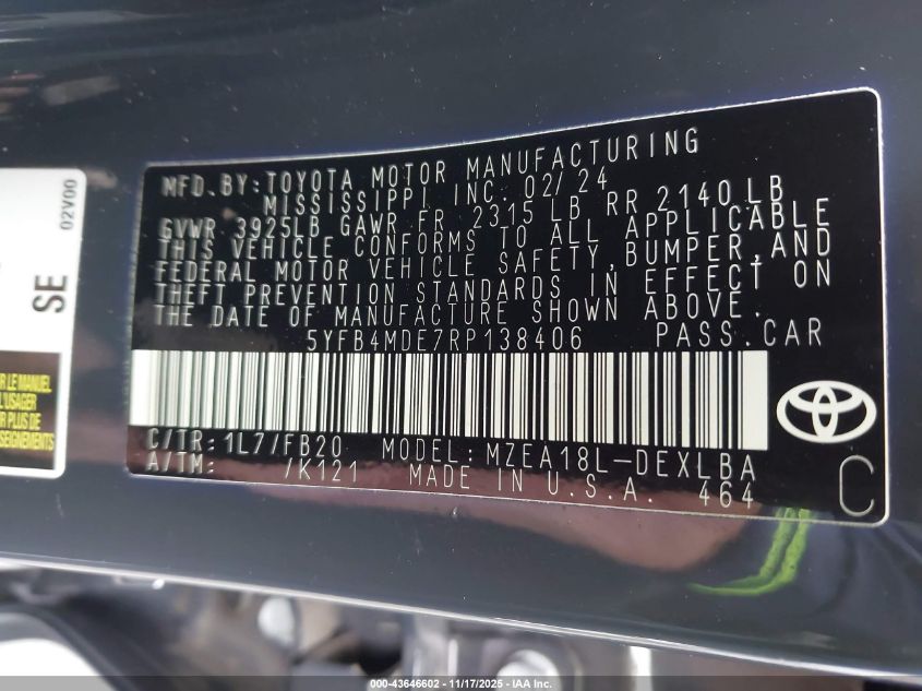 2024 TOYOTA COROLLA 2024 року Бензин, 2.0, Передний привод, vin - 5YFB4MDE7RP138406 из США