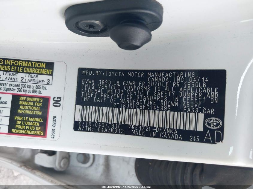 2014 TOYOTA COROLLA 2014 року Бензин, 1.8, Передний привод, vin - 2T1BURHE8EC145995 из США