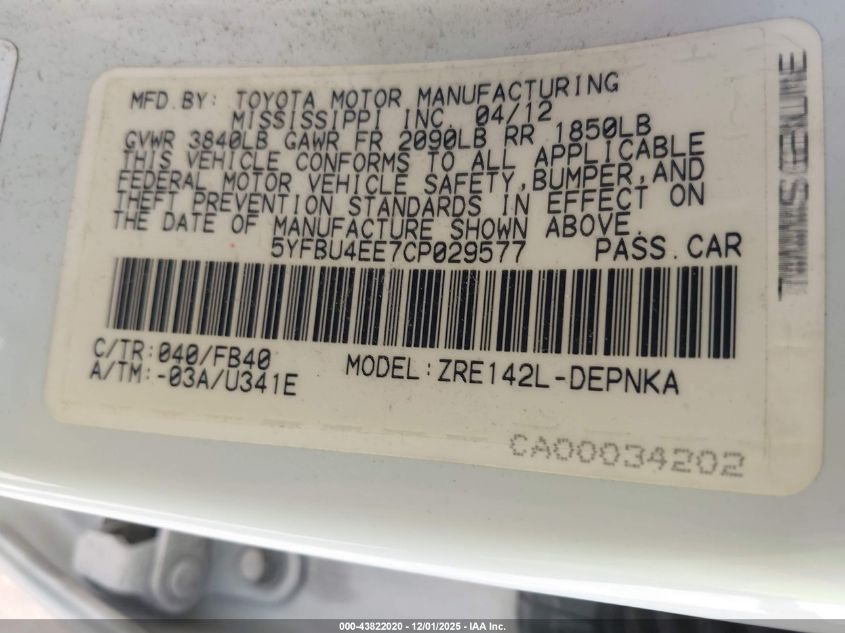 2012 TOYOTA COROLLA 2012 року Бензин, 1.8, Передний привод, vin - 5YFBU4EE7CP029577 из США